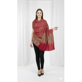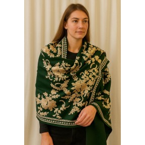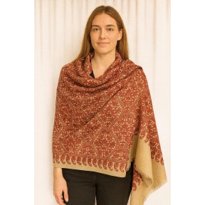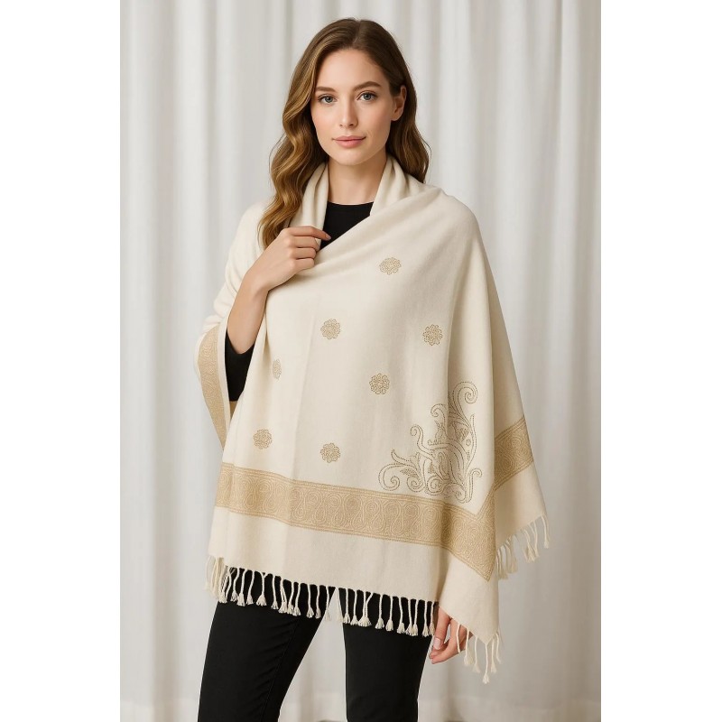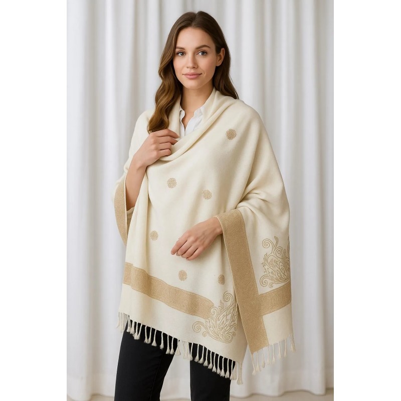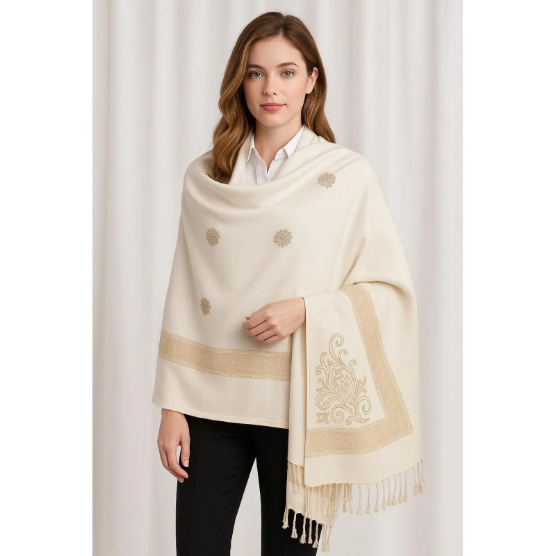 A classic ivory shawl accented with subtle gold medallion motifs and a refined gold border. One corner features an ornate scroll design for an elevated finishing detail, while the soft fringe hem adds gentle texture. The clean, minimal look makes it easy to style for both everyday layering and special occasions.