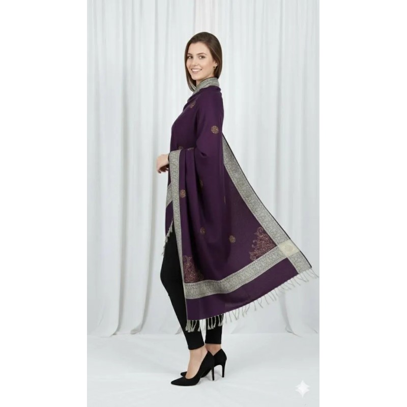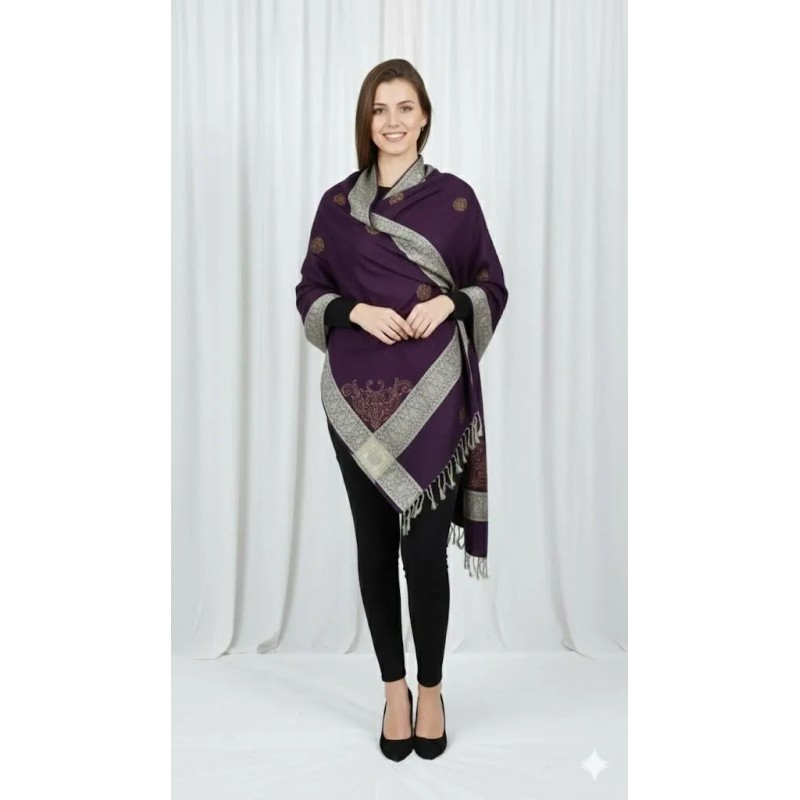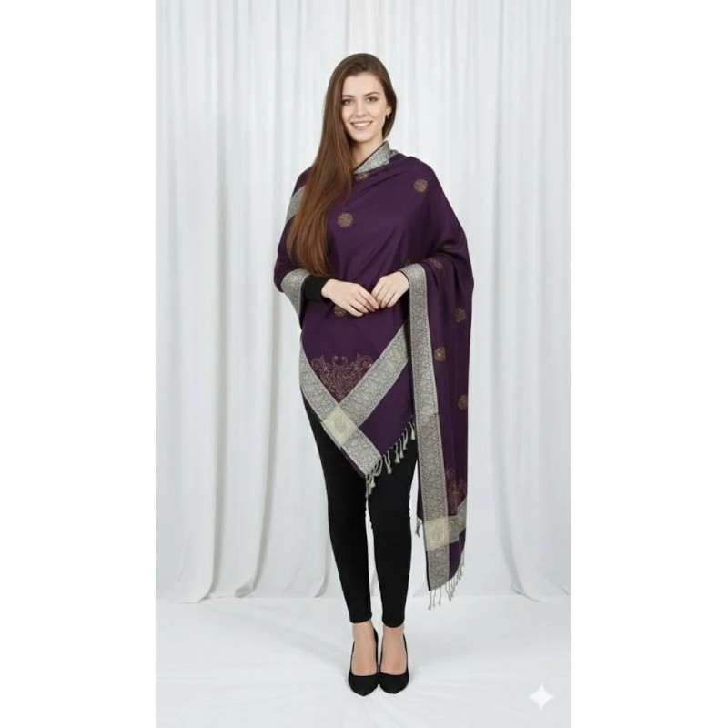 This rich purple shawl features a delicate silver paisley design, elegantly embroidered along the edges. The intricate embroidery adds a touch of sophistication, while the fringed hem gives it a stylish and modern finish. A versatile accessory perfect for layering over both casual and formal outfits.