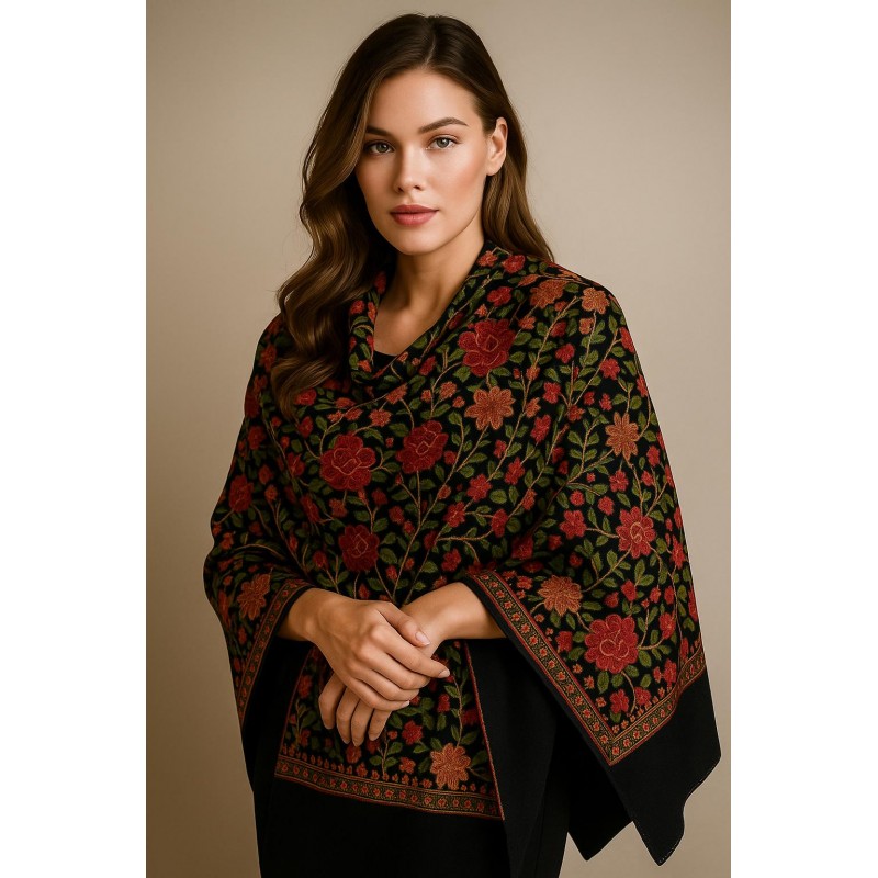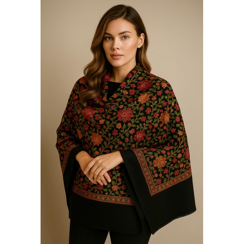 Make a refined statement with this black shawl featuring an all-over rose vine floral pattern in rich red, gold, and green tones. The tapestry-like design is finished with a coordinating border trim, giving it a polished, heritage-inspired look. Drapes beautifully over the shoulders for comfortable coverage and effortless layering.