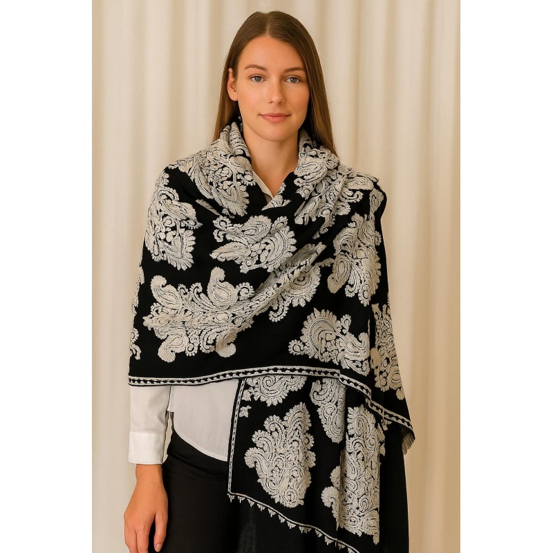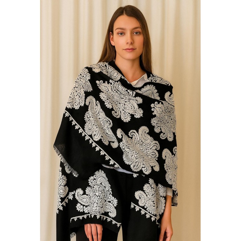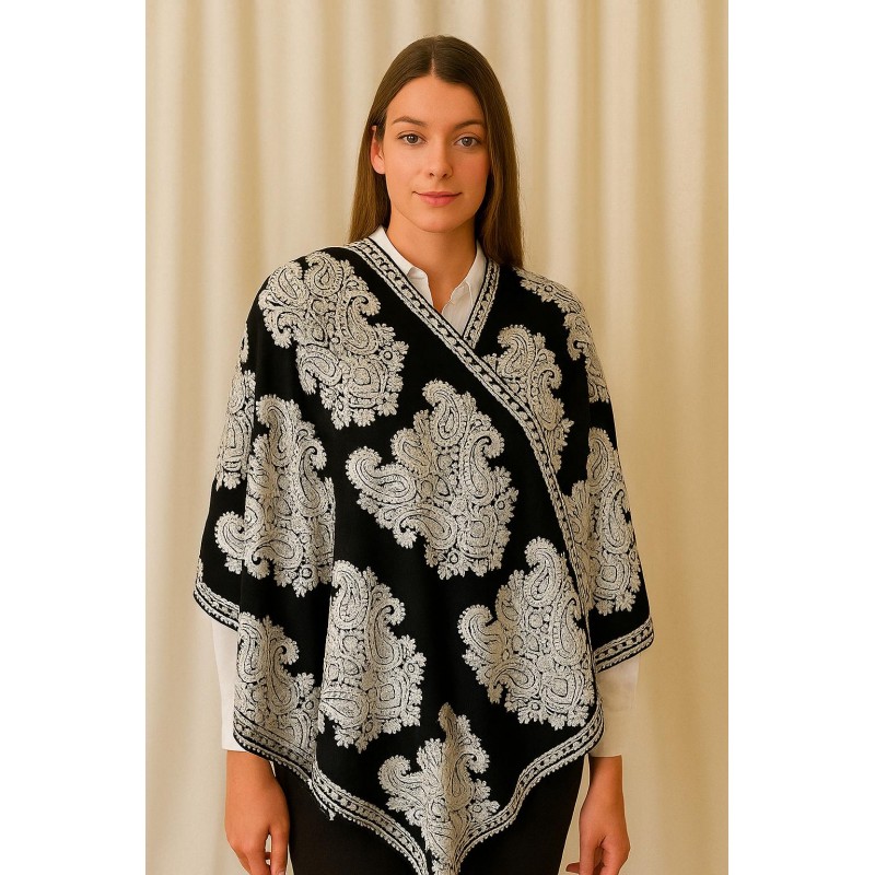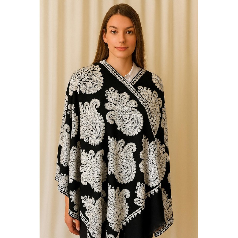 A bold, elegant shawl featuring oversized paisley motifs in ivory against a classic black base. The all-over pattern creates a rich, statement look, while the framed border and clean drape make it easy to wear as a poncho-style layer, shoulder wrap, or cozy scarf alternative.