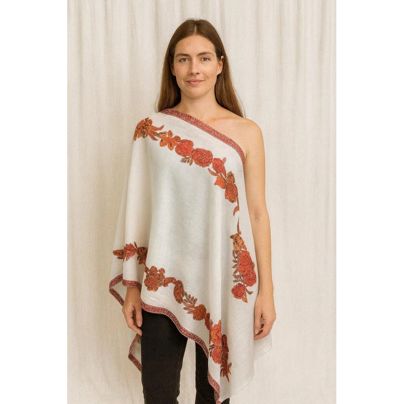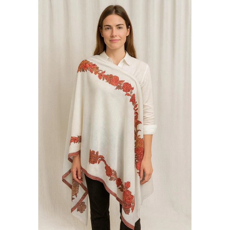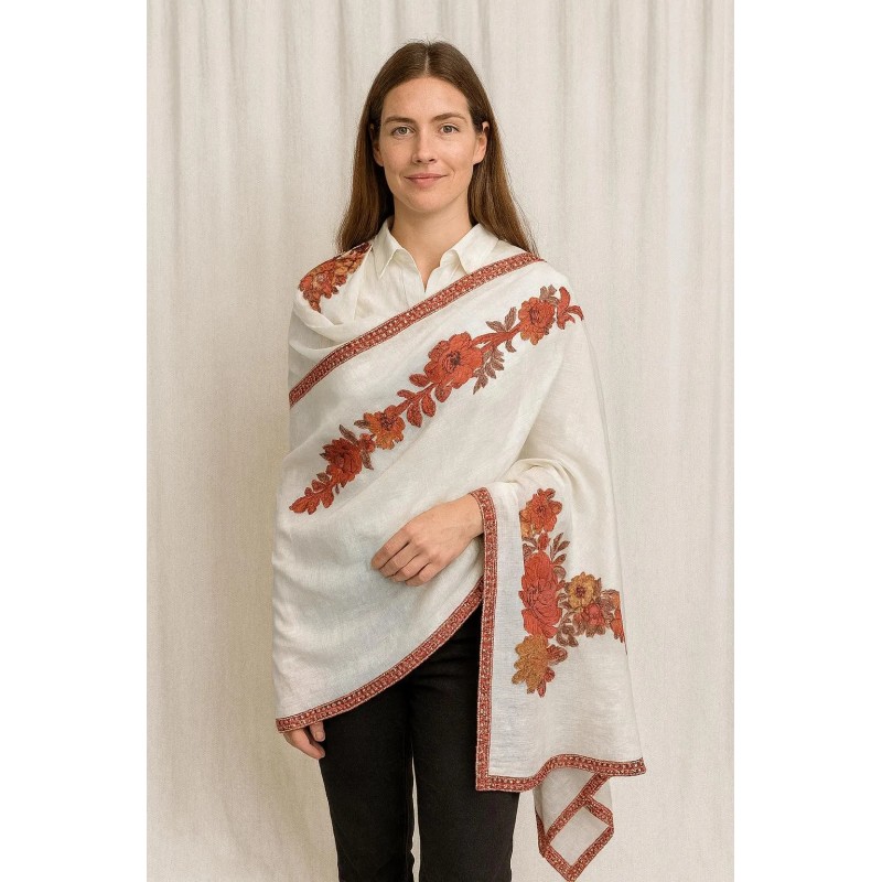 A graceful ivory shawl featuring rust-toned floral vine detailing and a coordinating border trim. The warm botanical pattern adds a refined, vintage-inspired touch, while the soft drape makes it easy to style over daily outfits or special-occasion looks. Finished with a neat edge and light fringe for a polished, elegant feel.
