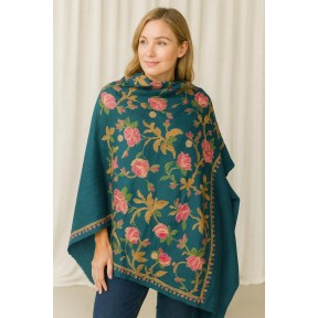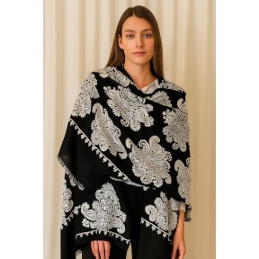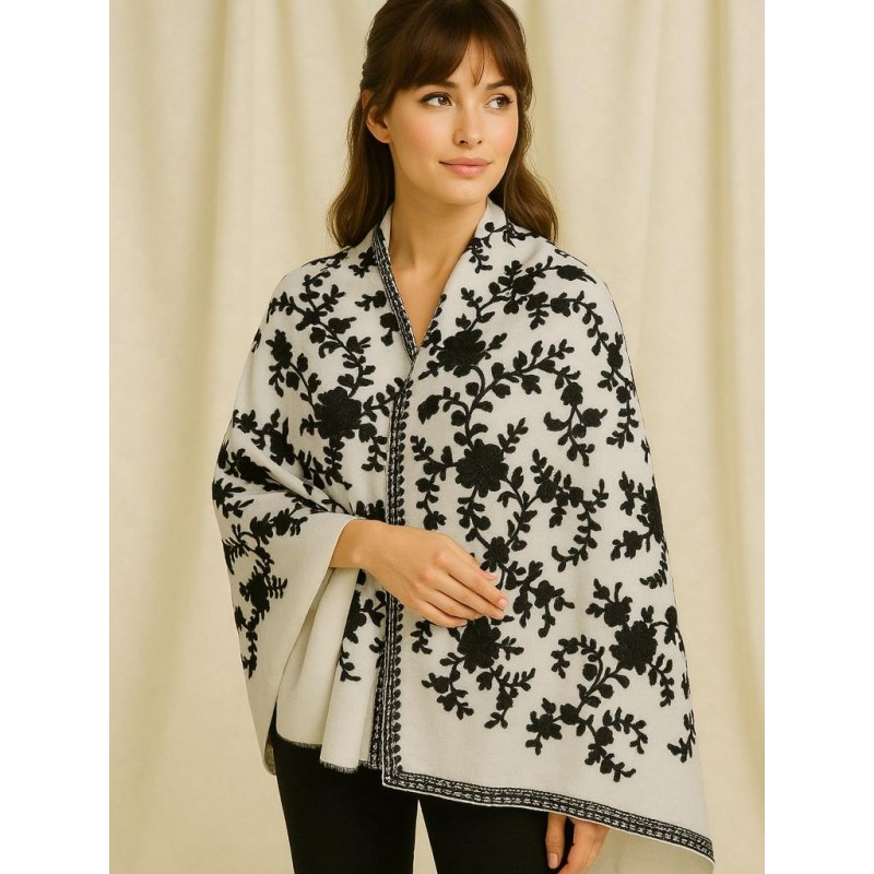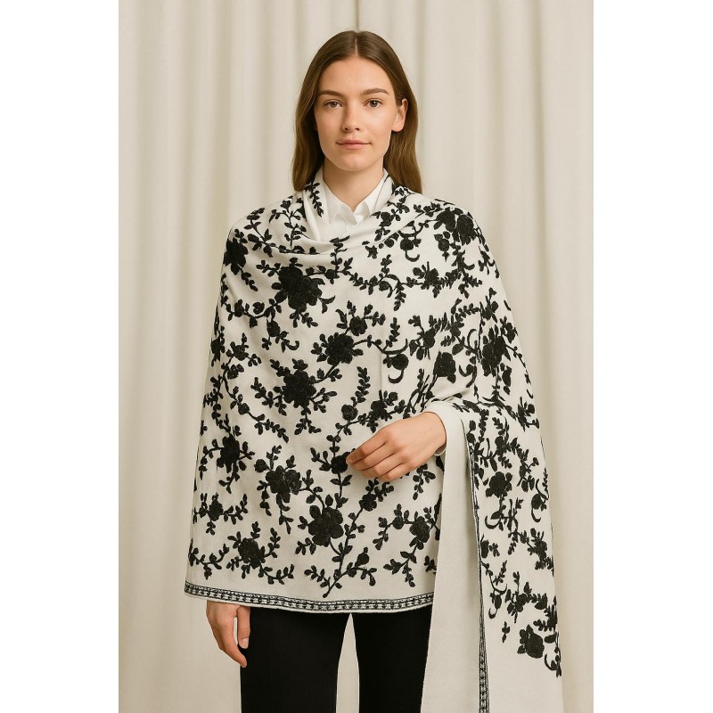 A timeless ivory shawl featuring an all-over black blossom pattern for a clean, high-contrast look. The delicate floral motif feels classic and easy to style, while the framed border adds a polished finish. Designed with a wide, poncho-style drape for comfortable coverage and effortless layering.